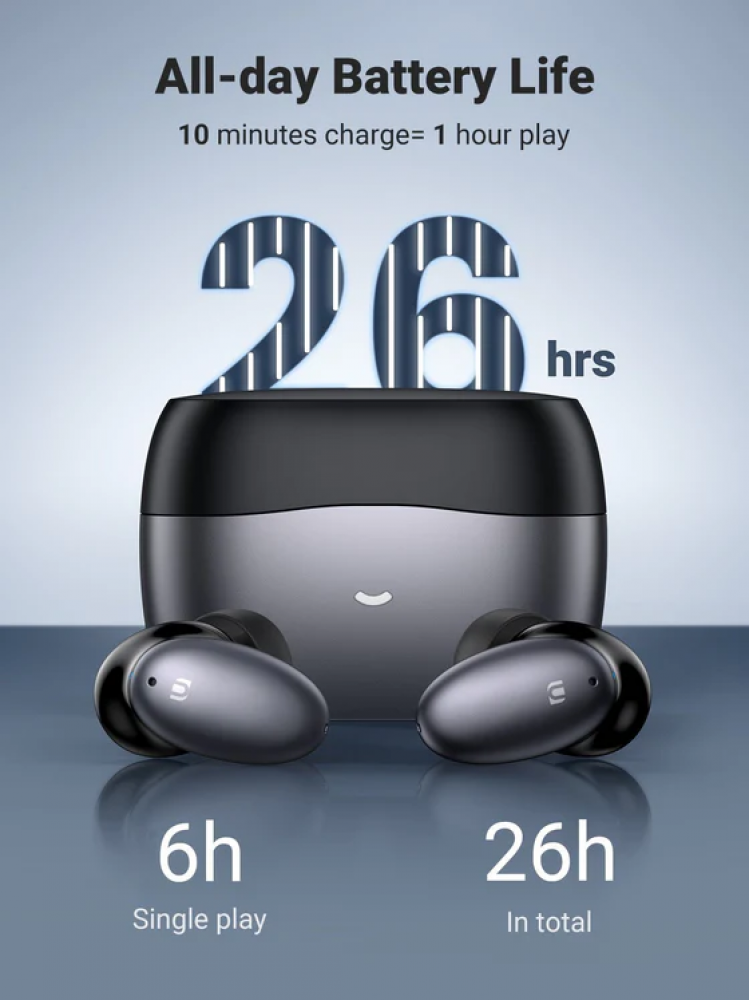 All-day battery life: 6 hours of playtime on a single charge, 26 hours of battery life with the built-in charging case. 10 minutes of charging restores 1 hour of playback, fully charge the earphones in 1.5 hours, fully charge the case in 2 hours.